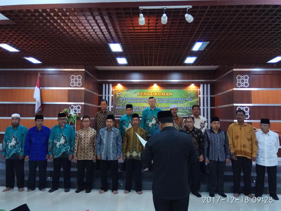 BERTEMPAT di aula Darunnadhwah, Masjid Agung Kabupaten Karimun, dua Ormas tingkat kabupaten dikukuhkan sekaligus Senin (18/12/17) pagi. MUI (Majelis Ulama Indonesia) dan FKUB (Forum Kerukunan Umat Beragama) Kabupaten Karimun, masing-masing dengan SK DPD MUI Provinsi Kepri Nomor KEP 057/ A/ MUI-KEPRI/ XI/ 2017 tanggal 4 Desember 2017 untuk kepengurusan bagian Dewan Pertimbangan dan Pengurus Harian. Sementara kepengurusan bagian komisi-komisi diSK-kan oleh Ketua Umum MUI Kabupaten Karimun.